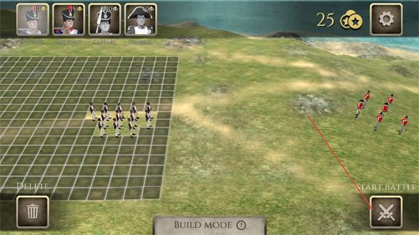1、在BUILTMODE布置己方火枪部队,点击STARTBATTLE进入战斗。