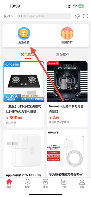 1、打开e城e家APP,在首页找到生活缴费选项并点击进入。