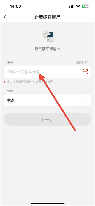 3、在页面输入燃气蓝牙智能卡的8位数字卡号,也可扫码识别,然后按提示操作即可完成添加。