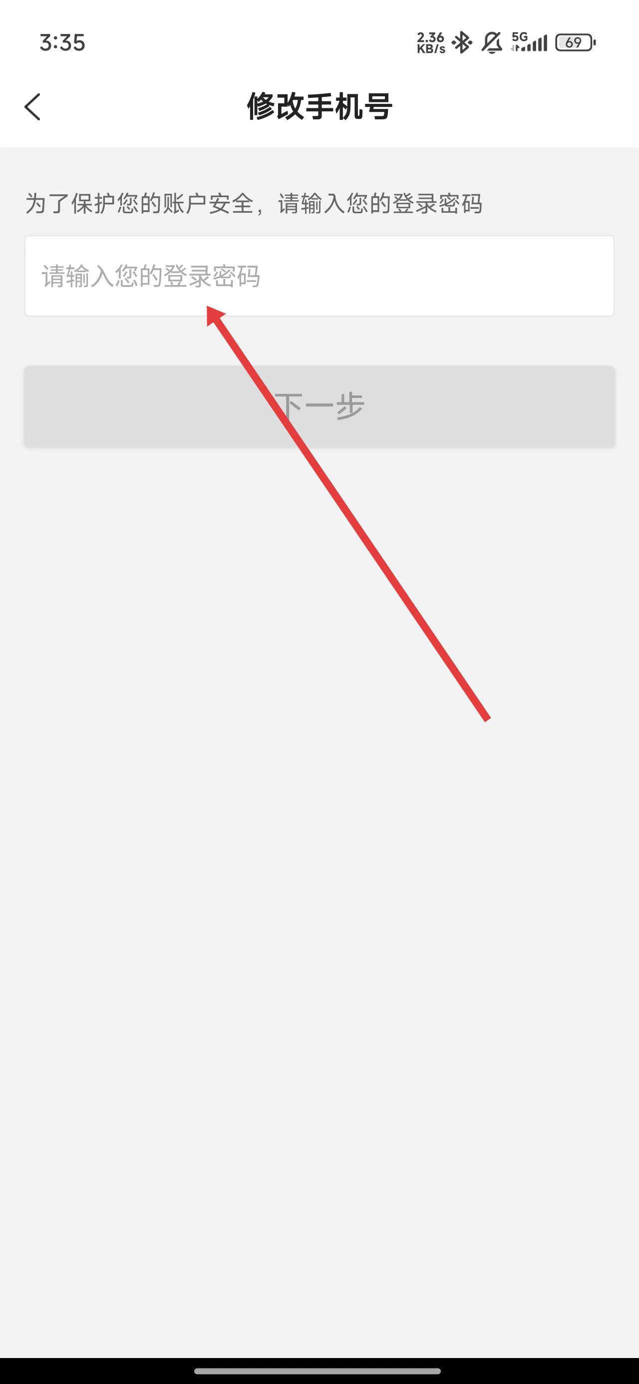 3、在修改手机号操作页面中,点击输入框输入登录密码后,进行修改操作。