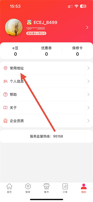 2、在个人中心页面,点击常用地址选项,进入地址管理页面。