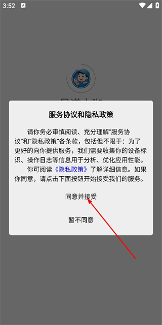 1、在使用协议隐私政策弹窗中点击同意并接受,进入登录页面。