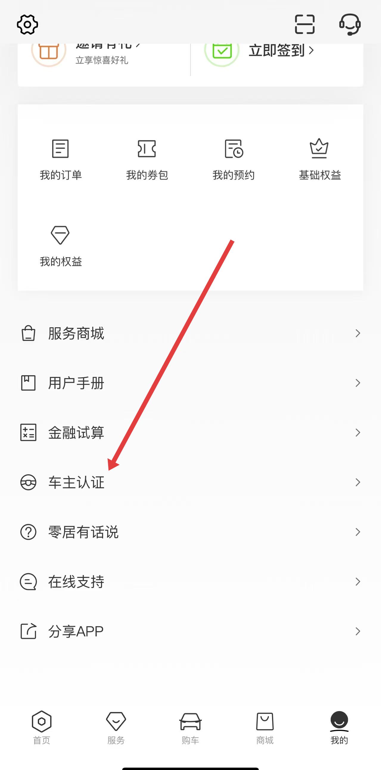 2、在我的页面中,向下滑动找到并点击车主认证选项。