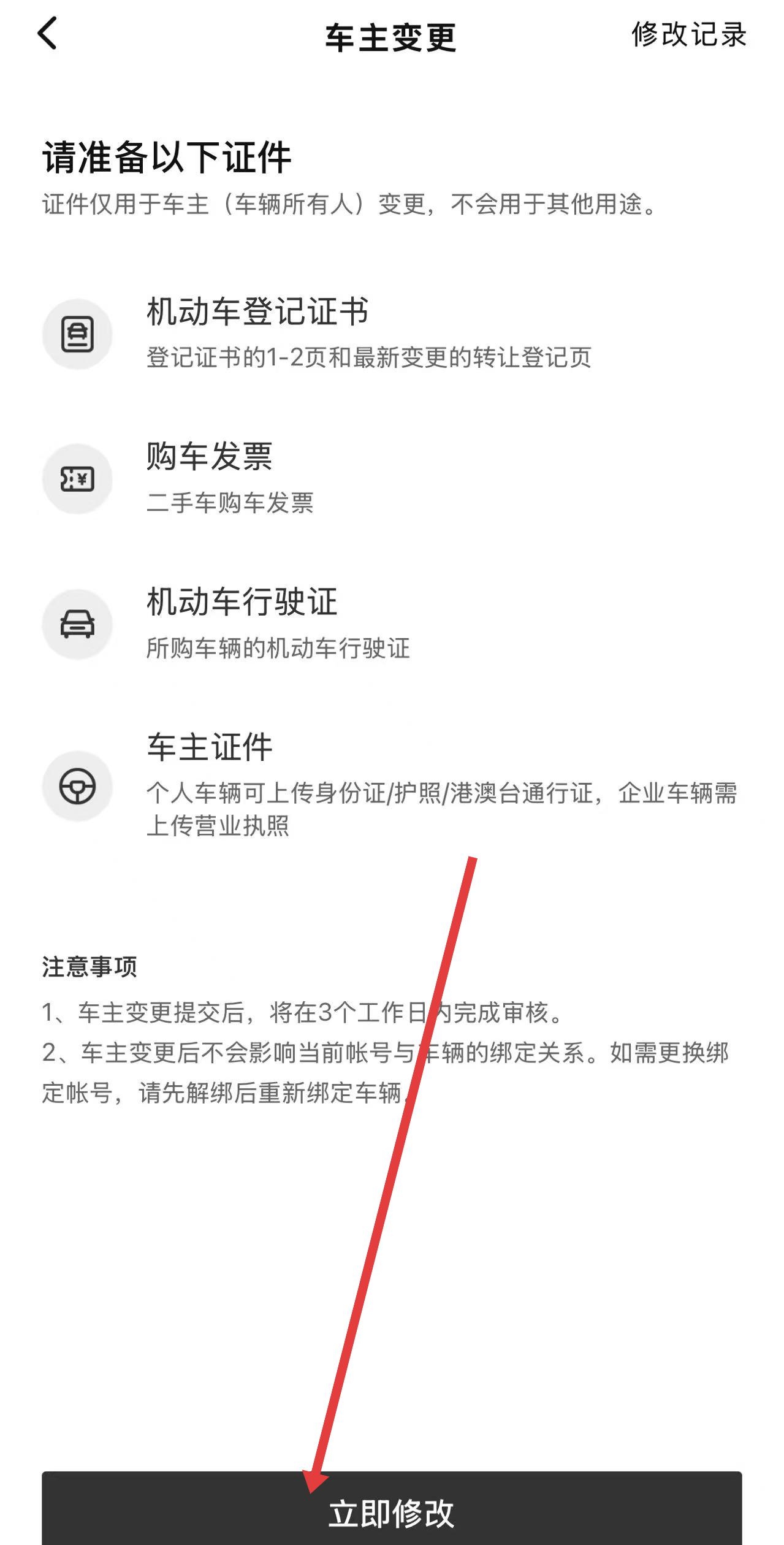 4、在车主变更页面,点击立即修改,按照提示上传对应照片并提交,等待审核即可。