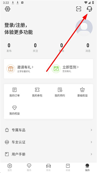 2、在个人中心页面,点击右上角的客服图标,弹出服务选项菜单。