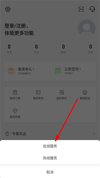 3、在服务选项菜单中,选择在线服务选项,即可进入与零跑app在线客服的沟通界面。