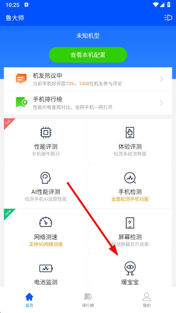 1、打开鲁大师应用,在首页功能列表中,点击暖宝宝选项,进入暖宝宝功能界面。