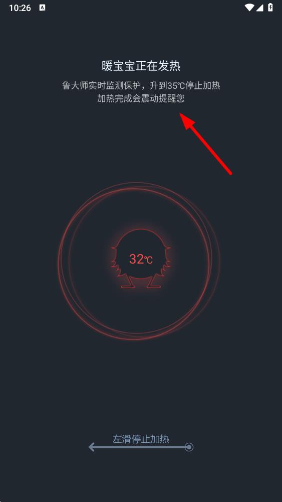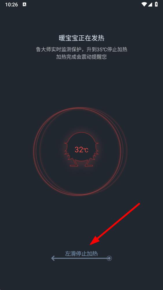 4、若想提前停止加热,按照界面提示,向左滑动屏幕,即可关闭暖宝宝的发热功能。