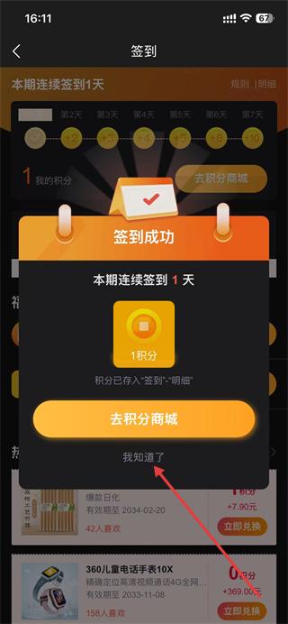 3、完成签到操作,选择并点击我知道了关闭弹窗。