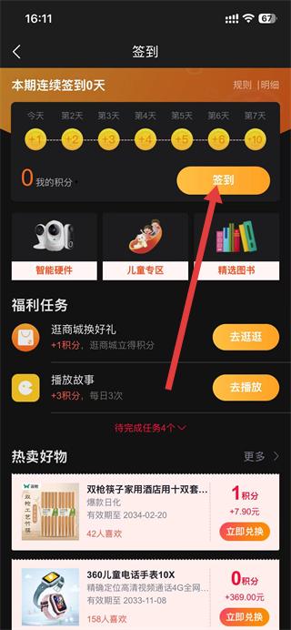 1、打开360儿童卫士App,点击页面顶部的签到图标。