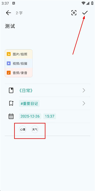 3、完成内容编辑后,点击右上角的确认按钮保存这条日记。