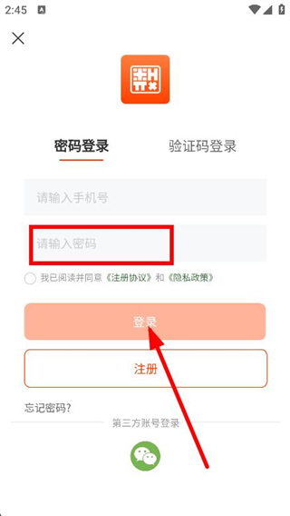3、在密码登录页面,填写需要登录的手机号码。