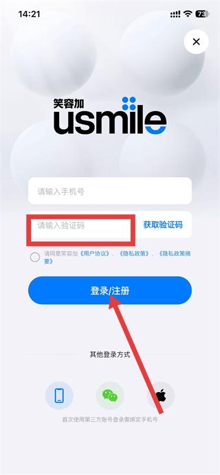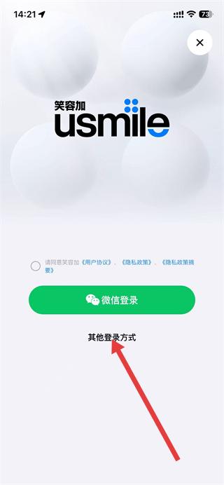 1、打开笑容加App,在登录页面,点击其他登录方式。