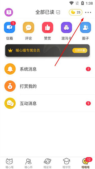 1、打开解忧暖心喵APP,点击底部导航栏的喵喵喵选项,进入消息页面。