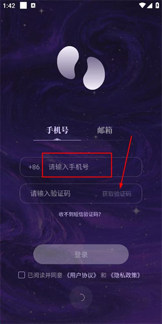 2、在登录页面填写手机号,勾选协议后,点击获取验证码。