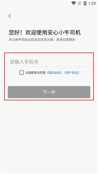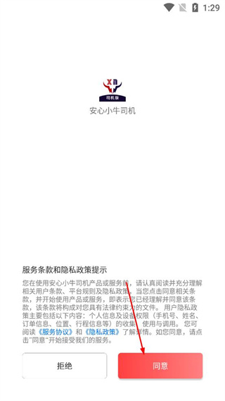 1、打开安心小牛司机,查看服务条款和隐私政策提示,点击界面中的同意按钮。