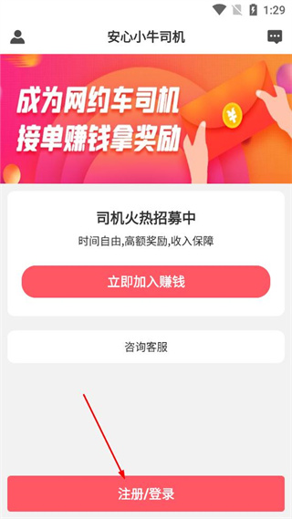 2、进入安心小牛司机主界面,找到页面底部的注册/登录选项,点击进入对应界面。