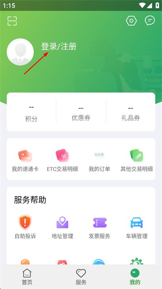 3、在个人中心页面,找到登录/注册选项,点击该选项进入乐速通的账号登录界面。