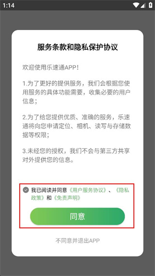 1、打开乐速通,查看弹出的服务条款和隐私保护协议,勾选同意选项后点击同意按钮。