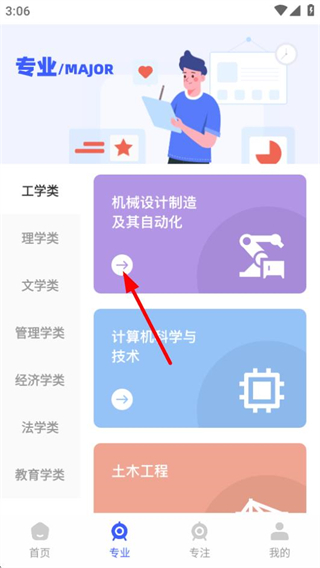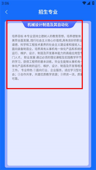 2、在专业页面,点击目标专业选项,可进入该专业的招生详情页面。