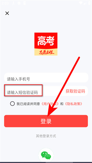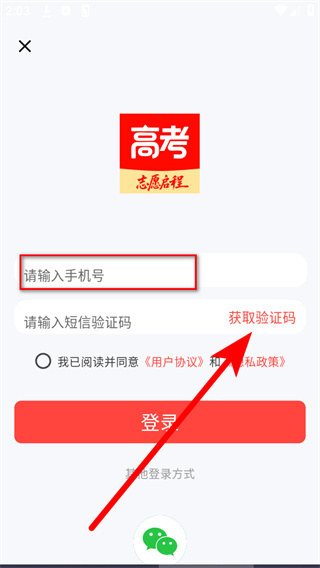3、在登录界面的手机号栏填写你的手机号,点击获取验证码。