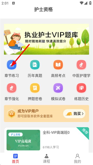 1、进入执业护士牛题库后,点击章节练习选项,可进入章节练习的分类页面。