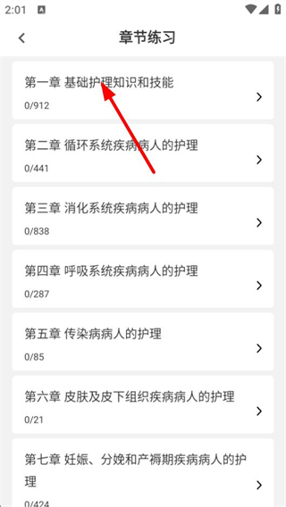 2、在章节练习页面,点击目标章节,可进入该章节的题目练习页面。