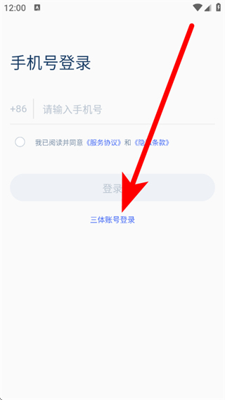 2、在手机号登录页面,点击三体账号登录,进入三体账号登录页面。