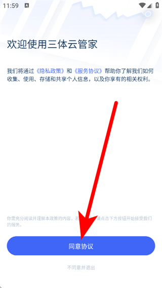 1、打开三体云管家后,在欢迎页面,点击同意协议,进入登录选择页面。