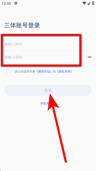 3、在三体账号登录页面,输入账号和密码,勾选后,点击登录,完成账号登录。