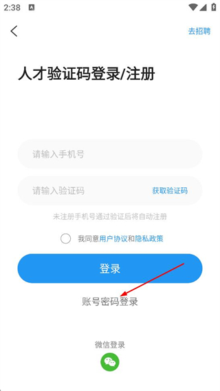 3、在验证码登录/注册页面,点击账号密码登录选项,切换至账号密码登录界面。