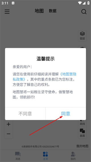 1、在温馨提示弹窗中,阅读地图慧隐私政策后,点击同意。