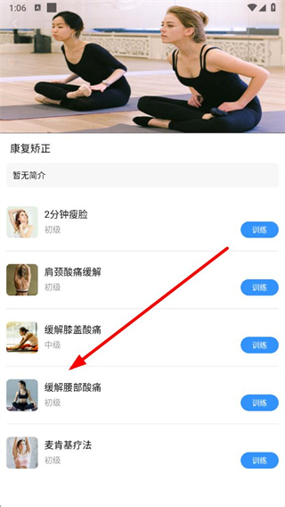 2、进入康复矫正页面后,在训练项目列表里,点击缓解腰部酸痛右侧的训练按钮。