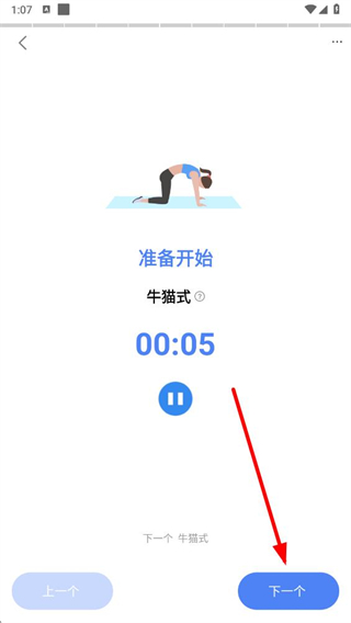 4、训练过程中可通过下一个按钮切换动作,完成整套居家锻炼内容。