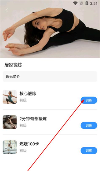 2、在居家锻炼页面选择目标训练项目,点击右侧训练按钮。
