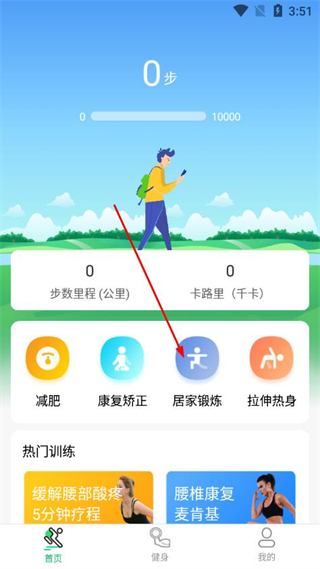 1、打开运动走路计步器APP,在首页点击居家锻炼分类选项,进入居家锻炼页面。