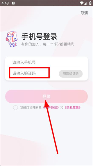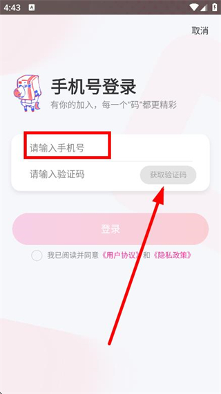 3、进入手机号登录页面,填写手机号,获取验证码。