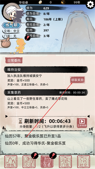 4、待任务完成后点击领取奖励,获取金币、声望等奖励提升自身。