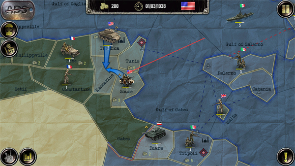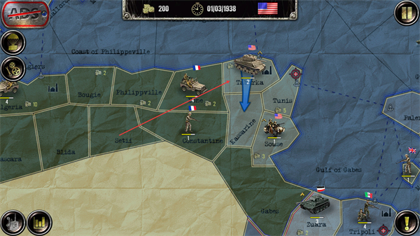 3、选择己方坦克部队,规划移动路线如向Tunis方向推进,调整部队位置。