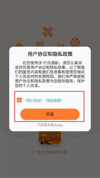 1、打开沃行讯通后,弹出用户协议和隐私政策弹窗,勾选对应选项,点击同意按钮。