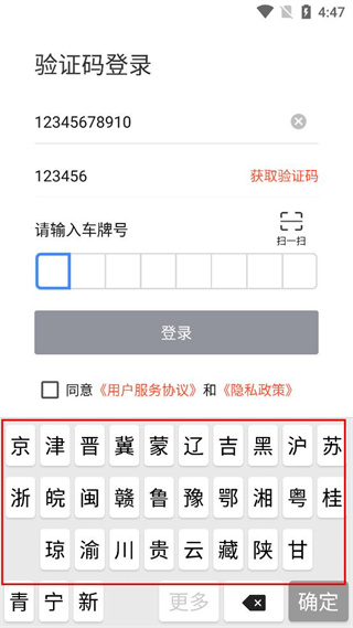 3、输入收到的验证码,接着选择车牌对应地区并填写完整车牌号信息。