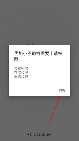 1、打开优加小巴司机端,查看权限申请提示框,点击界面中的好的按钮。