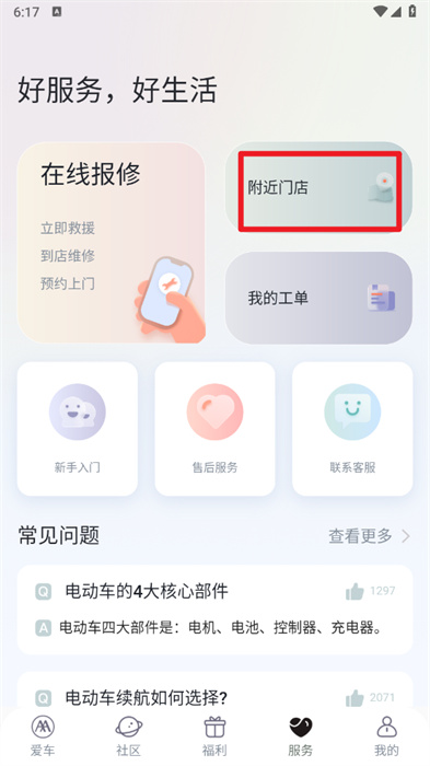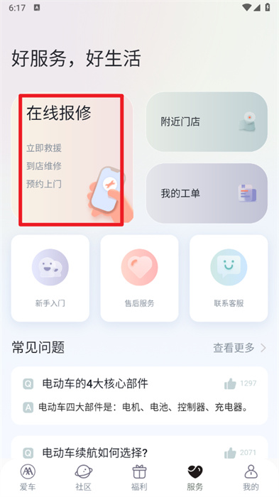 1、进入到应用之中后,用户可以点击服务栏的【在线报修】功能来进行爱车的报修;