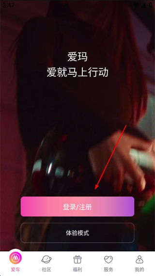 2、进入主界面后,找到登录/注册选项,点击该选项进入爱玛出行的登录界面。