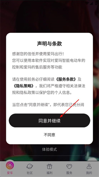 1、打开爱玛出行,查看弹出的声明与条款,点击界面中的同意并继续按钮。