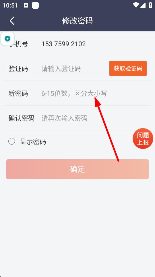 4、进入修改密码页面,输入手机号,点击获取验证码,并再次输入新密码进行确认,最后点击确定即可完成。