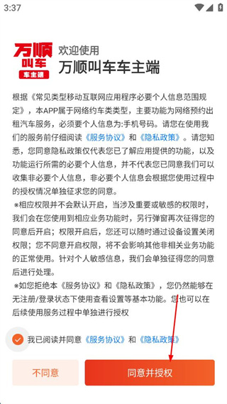 1、打开万顺叫车车主端,勾选已阅读并同意相关条款,点击界面中的同意并授权按钮。