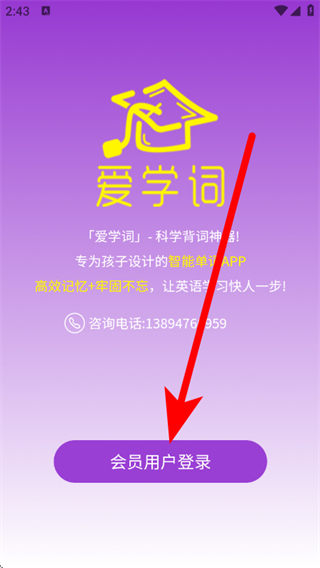 2、在爱学词的欢迎页面,点击会员用户登录,进入登录页面。