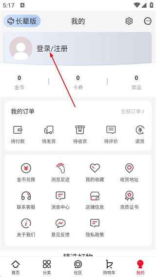 2、在个人中心页面,点击登录/注册按钮,进入登录界面。