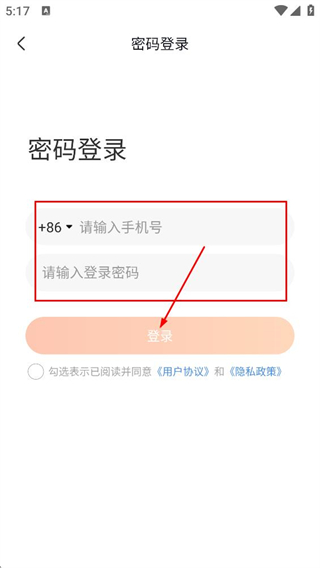 4、在密码登录界面,填写手机号和登录密码后,点击登录完成登录。